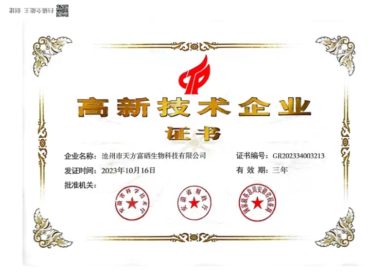 近日,池州市天方富硒生物科技有限公司正式通過高新技術(shù)企業(yè)認定,榮獲由安徽省科學技術(shù)廳、安徽省財政廳、國家稅務(wù)總局、安徽...